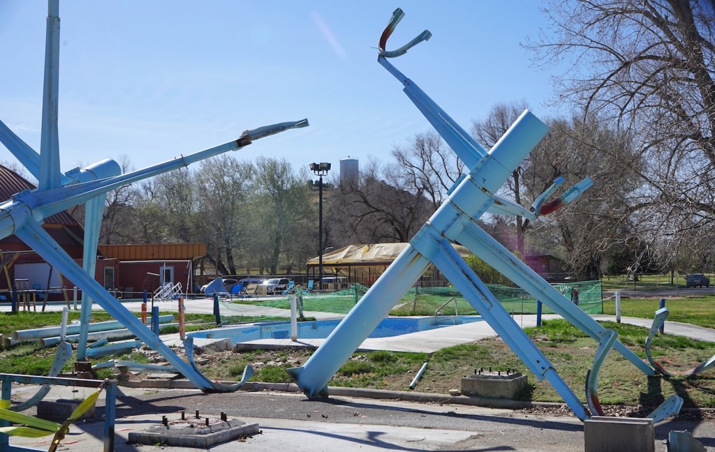 While the Plunge has been closed, the state and other concessionaires have completed updates elsewhere in the park, including installing a new boat ramp, fixing paved roads and reinforcing a hanging bridge over the Bighorn River. A faded blue outdoor waterslide at Hellie’s Tepee Pools was recently dismantled, and crews are scheduled to replace the wooden boardwalks on the mineral terraces this summer.
