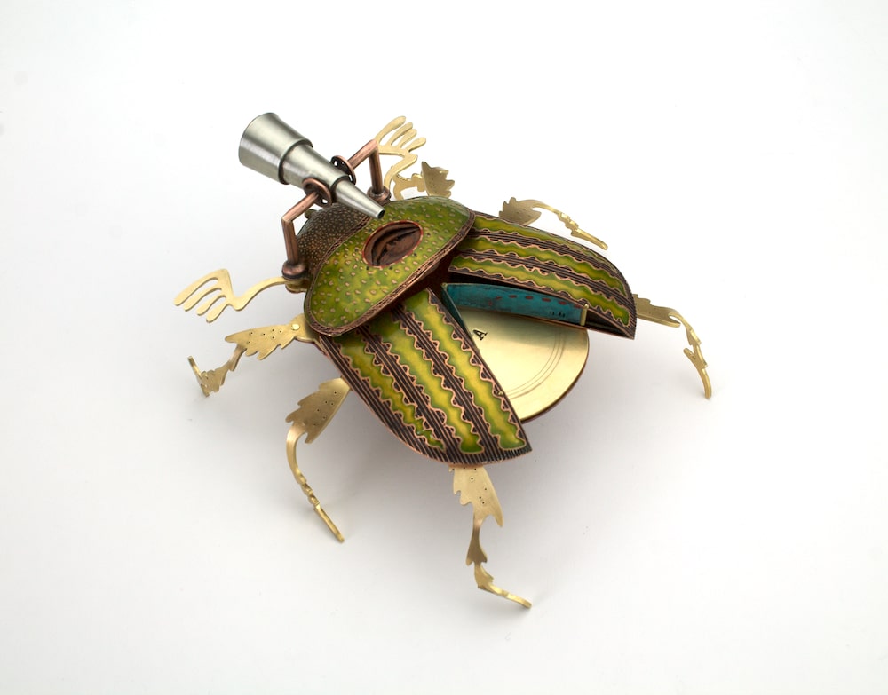 Next to Wehr’s book is an attractive metal June beetle by Laramie artist Leah Hardy. I was not sure how this was a book, but it fit the theme anyway. Hardy further titled it a Celestial Fortune Cookie. I thought it might be a Wyoming version of the ancient Egyptian scarab beetle, as on the bug’s back she drew something like the Eye of Providence (the one that tops the pyramid on the dollar bill) looking through a little telescope. I don’t know, that’s how I read it. Hardy wrote, “June Beetle and the Celestial Fortune Cookie symbolically allows one to gain personal insight into the universe — or simply into oneself .”