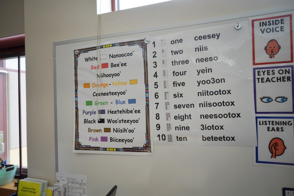Cornerstones of that plan include trauma-informed instruction that weaves in Arapaho language utilizing certified Hinono’eitiit instructors, weekly cultural celebrations and regular community events to foster family involvement. Students attend Hinono’eitiit class daily.