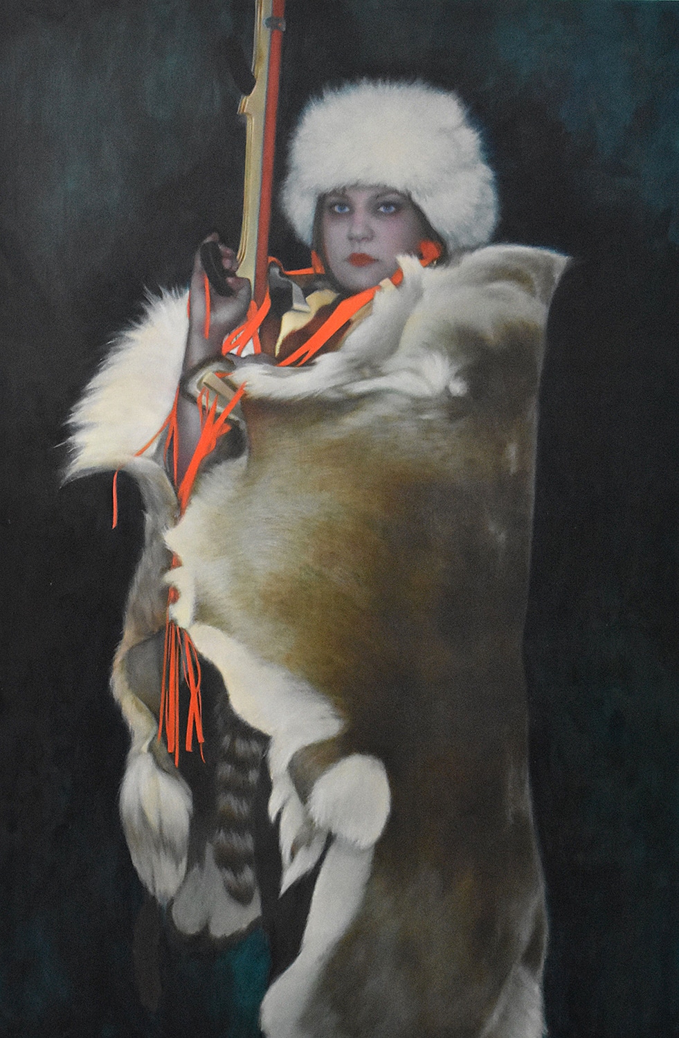 In other portraits, the paint layer is more uniform, and the figure is sometimes accentuated with gold leaf. Silhouetted against flat, intense color, the women appear symbolic, and call to mind star athletes on magazine covers, icons of Russian saints or with their furs and casually cradled rifles, perhaps avatars of Artemis, goddess of the hunt.