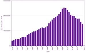 “Drilling responds to new leases with a lag as well as prices and market conditions,” he wrote. “I found that the average term of leases is five years. So after five years the bank of leases is depleted and there are no leases available to drill.”