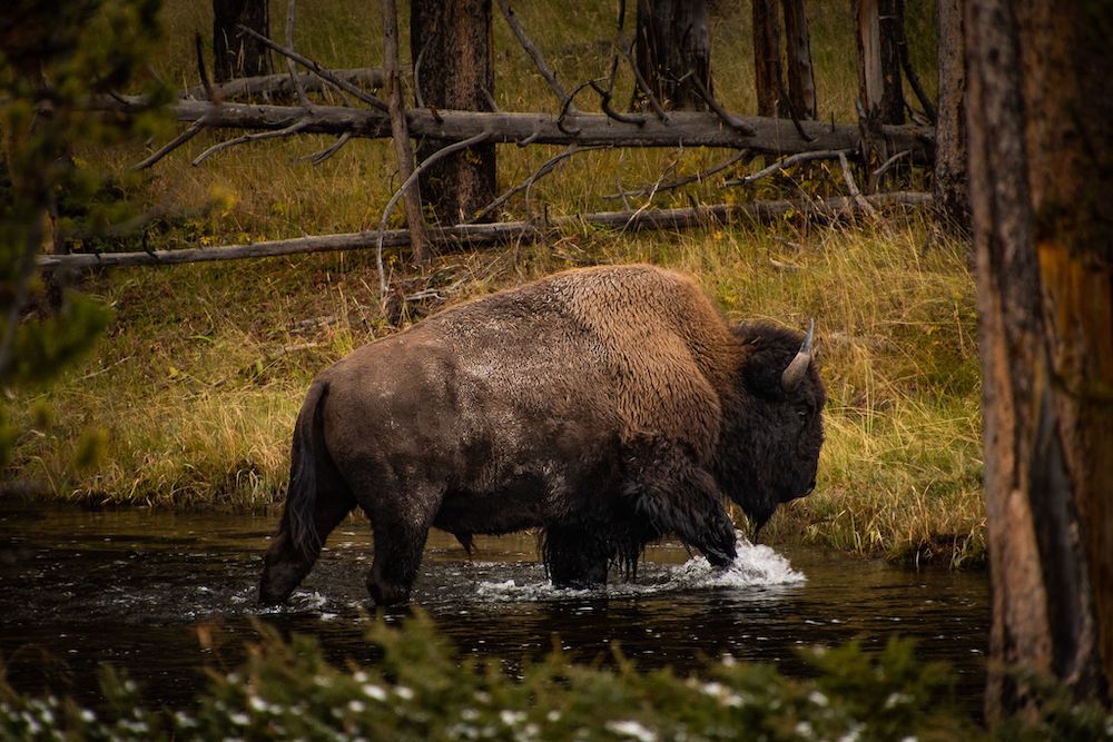 But when the family happened across a herd of bison and stopped, Bollinger trained her camera instead on the animals. As the bison began to cross a river, Bollinger told WyoFile, she noticed a massive bull.