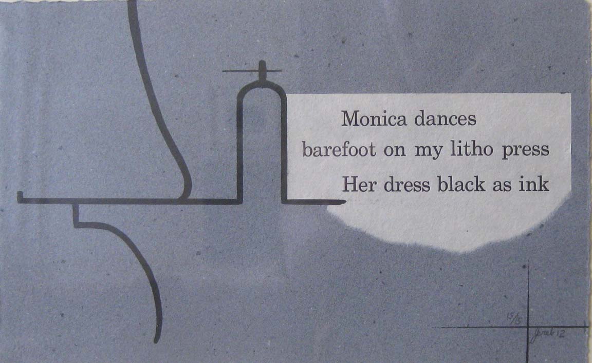 My favorite piece in the show is “Monica”, a combination of letterpress and lithograph. This piece relies absolutely on only the simplest of lines, which barely outline a press, with one line stretching up — Monica’s leg or maybe the line or her dress, dancing on the press. The letterpressed words are printed on a separate piece of paper, carefully torn and cut to fit perfectly, and collaged on. More than any other, this piece reminds an artist that less can definitely be more — and that one can rely on the viewer’s imagination to fill in the blanks of a very interesting story.