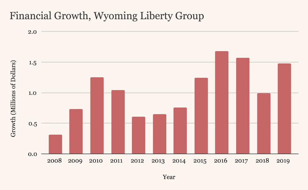 In 2009, the Wyoming Liberty Group reported more than $733,000 in gross receipts. The following year, the organization reported more than $1.25 million. Between 2011 and 2019, the Wyoming Liberty Group would report gross receipts of more than $10 million, reaching a peak of $1.679 million in 2016. Much of that money, according to IRS documents, came from Gore. Between 2008 and 2012, Gore (and another unlisted donor) provided more than 75% of the group’s funding.