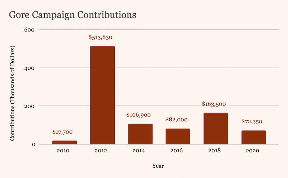 Out of the 22 candidates Gore contributed to in the 2020 primaries, half relied on her support for at least one-fifth of their total fundraising. Her support comprised half of the campaign totals for four of those candidates.