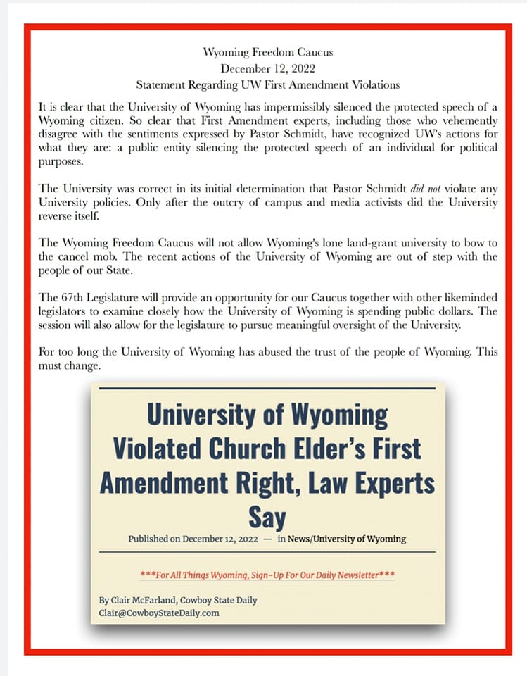 “It is clear that the University of Wyoming has impermissibly silenced the protected speech of a Wyoming citizen,” the caucus said in a statement at the time. “The Wyoming Freedom Caucus will not allow Wyoming’s lone land-grant university to bow to the cancel mob. The recent actions of the University of Wyoming are out of step with the people of our State.”