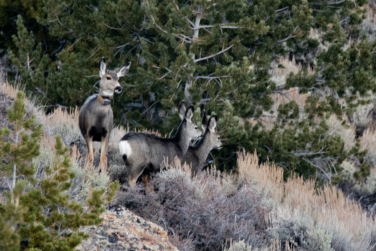 Crouching motionless in an aspen grove teeming with mule deer nibbling on spring green-up. Clambering up a precipitous and deadfall-covered slope in search of a collar signal. Slogging through mud in a growing blizzard that soon made a sighting unlikely. And, one winter day, watching the objective — ultra-migrating Deer 255 — in the sagebrush, nosing through undergrowth with fawns, unbothered by her observers.
