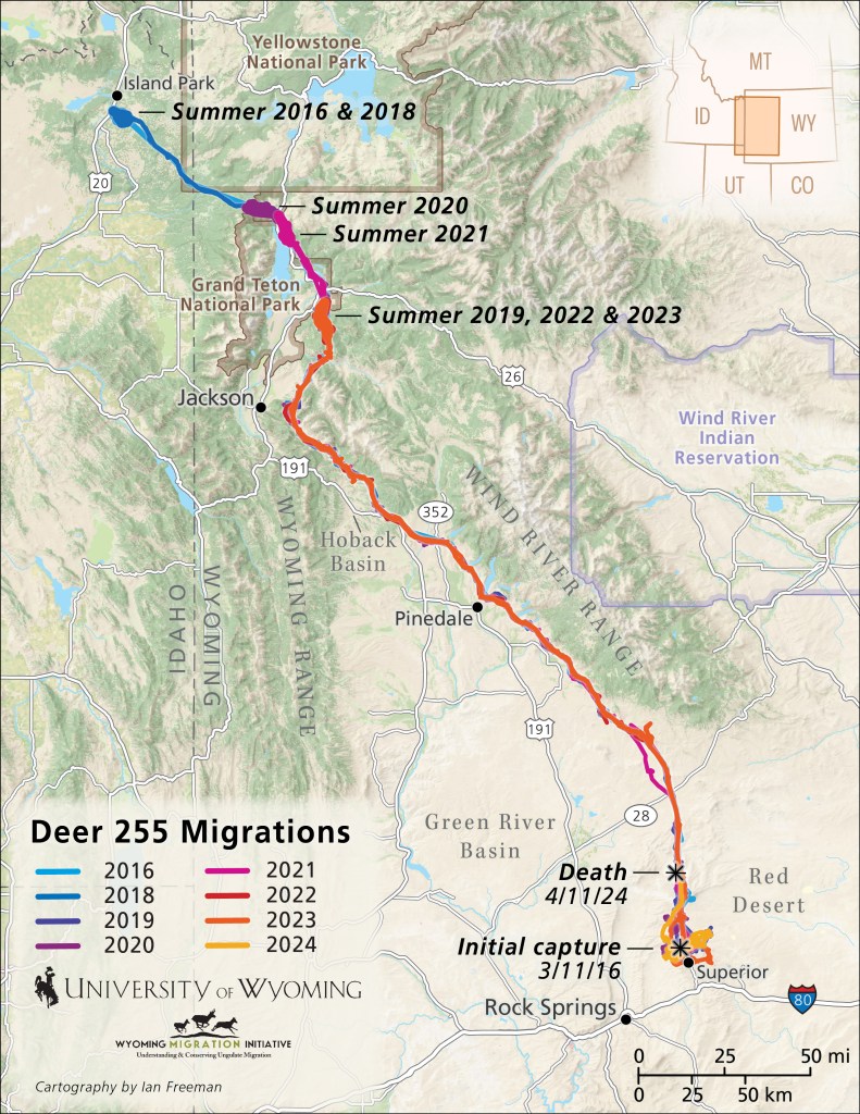 Researchers with the University of Wyoming and Wyoming Migration Initiative first caught and fitted Deer 255 with a tracking collar in March 2016.