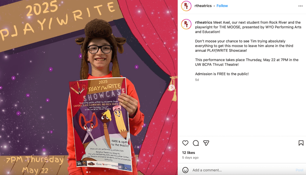 Bowling approached Mason and pitched the idea, explaining he saw a need for additional arts education in the local school system that didn’t cost school districts more funding. Relative Theatrics, he said, could serve as a “third-party arts education provider.” After a year of fundraising, the program launched in two elementary schools in 2023. Bowling hopes to expand into one or two more schools next year. Ultimately, he wants Play/Write to serve as a model for programs in other Wyoming counties.