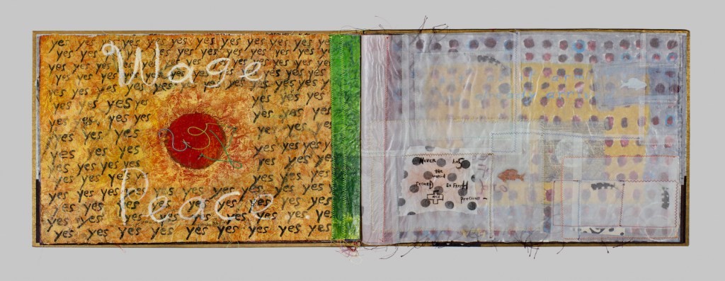Another of the least traditionally book-like works — and one I was especially drawn to — was by Andrea Przygonski of Adelaide, South Australia. Przygonski’s “Dream Travels During a Pandemic” derives from “being locked down with nowhere to go but our imagination.” It features a series of standing found slides — remember slides? — with digital images and digital collages on transparencies, the slides going zigzag like the extended bellows of two accordions with a light shining between and guiding them, a dream of distance and motion, glowing blue and white across a transparent bridge. I’m not so much describing the work as inviting viewers to see it and to see all the work in this exhibit exploring the limits and possibilities of the book — a vessel that carries more than we might expect.