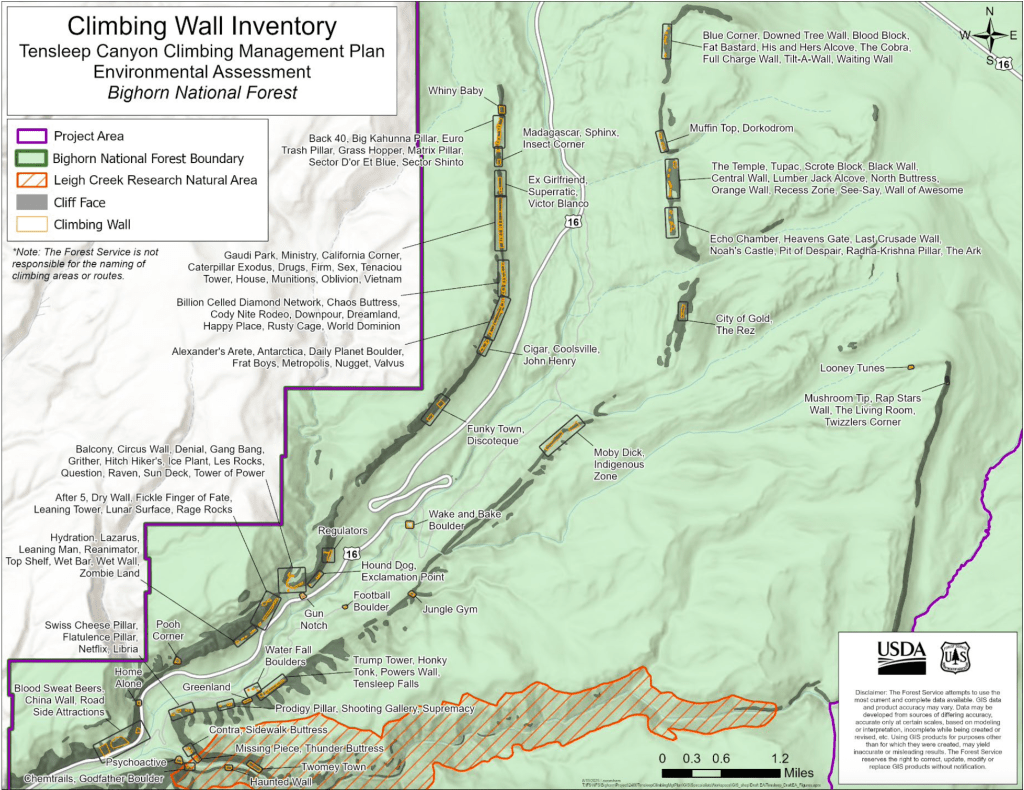 The project area encompasses 26,544 acres located in the southern Bighorn range between the towns of Ten Sleep and Buffalo. Though area recreators also include OHV riders, hunters and skiers, the plan hones in on climbing.