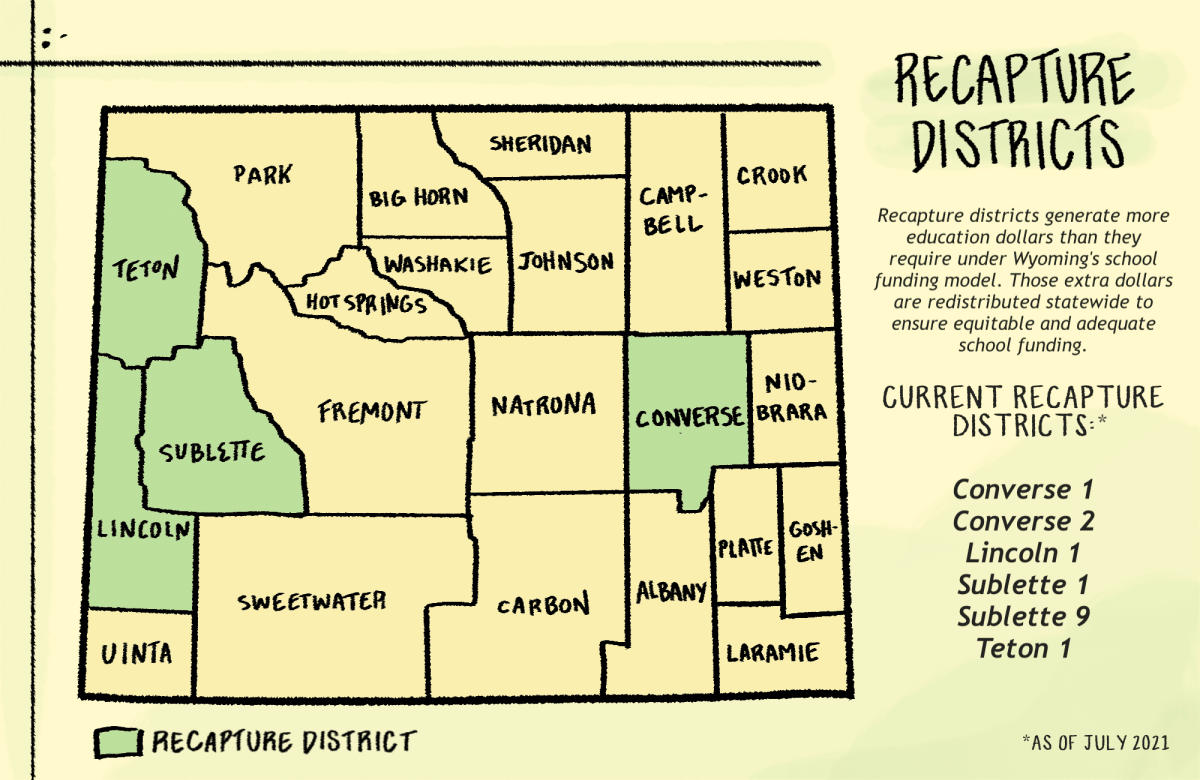 Districts in five counties were categorized as recapture for the 2020-21 budget year: Campbell, Converse, Lincoln, Sublette and Teton. For all but Teton County, which shifted to a recapture district in 2018, mineral extraction accounts for their ability to help balance funding for school operations statewide.