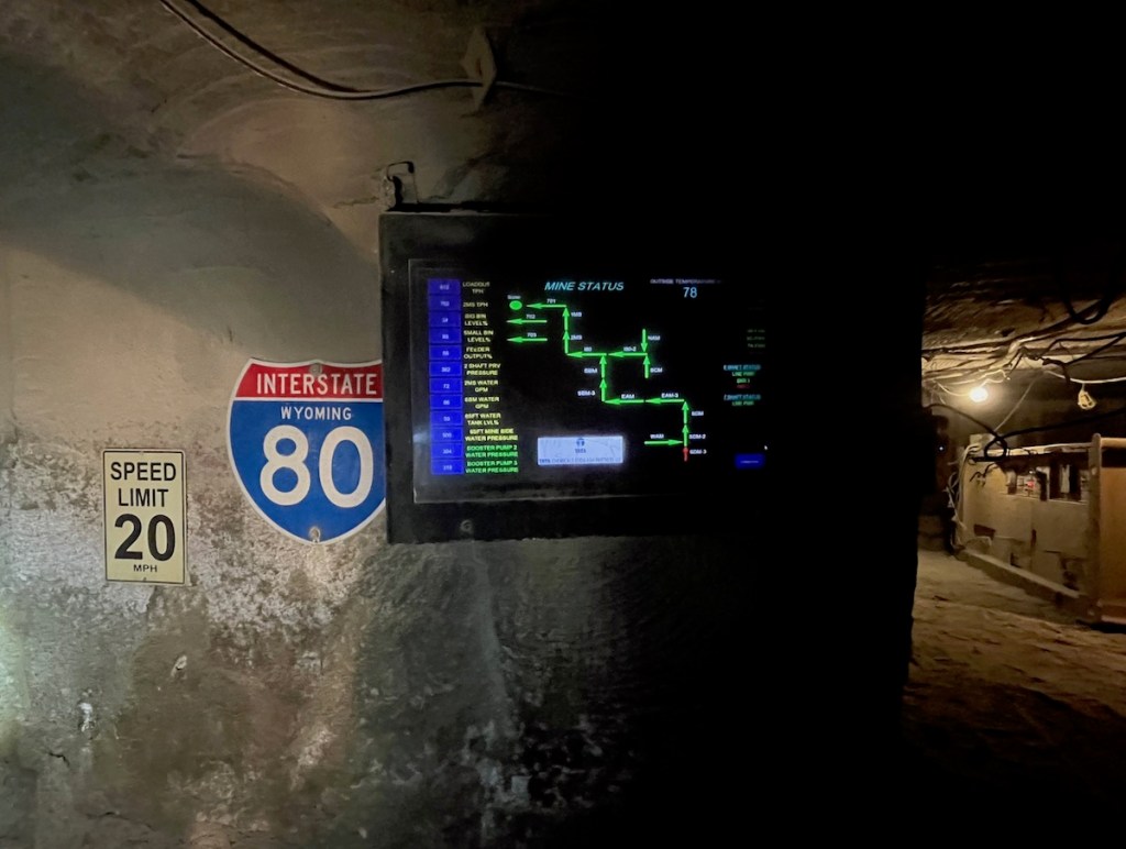 An Interstate 80 sign marks the spot where Tata Chemicals’ underground tunnels finger under the roadway where cars and semis are whizzing by 1,600 feet above. The trona mine includes many miles of tunnels from decades of mining. (Dustin Bleizeffer/WyoFile)