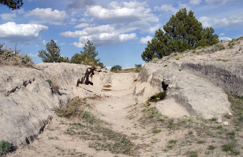 And in eastern Wyoming, right outside Guernsey State Park, you can see where those wagons coursed across the landscape. Ruts sometimes up to five feet deep cut through soft sandstone, visible a short walk from the site’s parking lot.