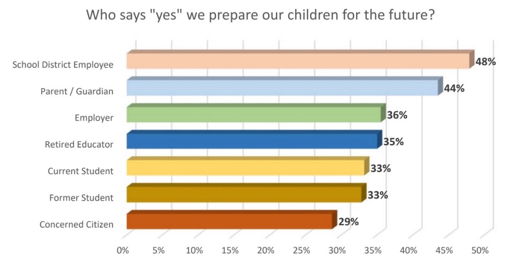 The group surveyed more than 7,000 stakeholders and held 17 listening sessions to gather feedback from the state. Most survey respondents identified themselves as parents or guardians. Nearly 60% of respondents said they do not believe children are being adequately prepared for the future, and the themes for improving the preparation of children identified by the most respondents included “learning outcomes and expectations” and “class content and structure.”