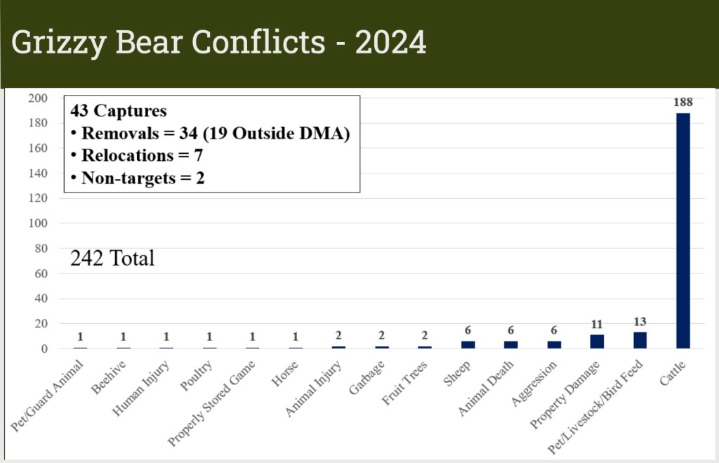 A graph Debolt presented showed that upwards of 60% of all verified grizzly conflicts in 2024 occurred on private property.