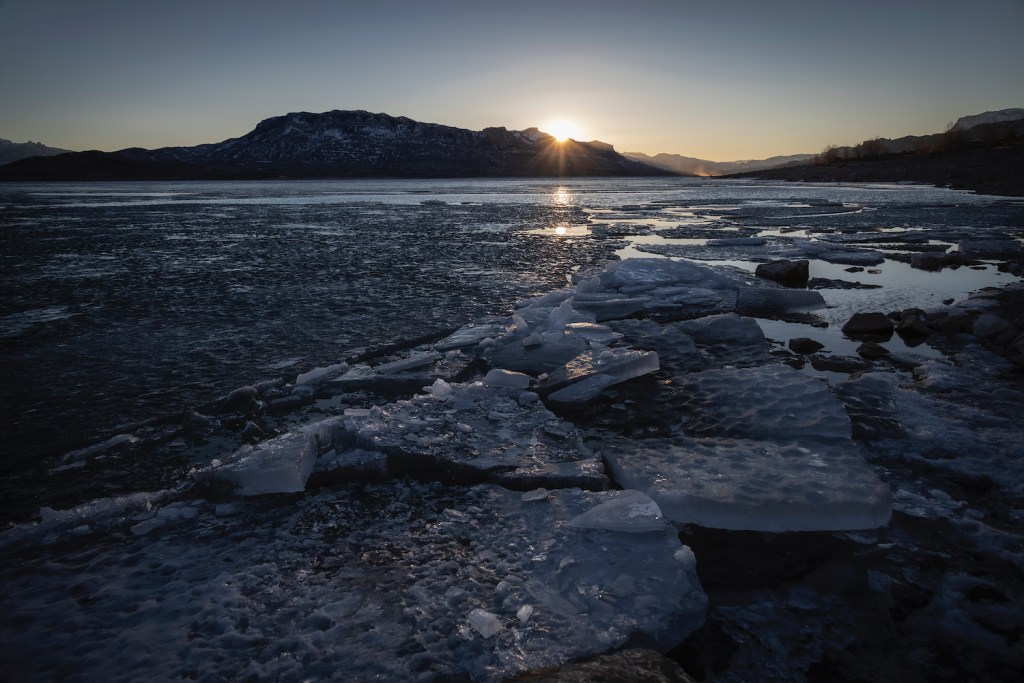 As the sun set and the moon rose, she wrote in an email, ethereal light cast over ice slabs on the surface of Buffalo Bill Reservoir and crystalline cylinders near the shore.