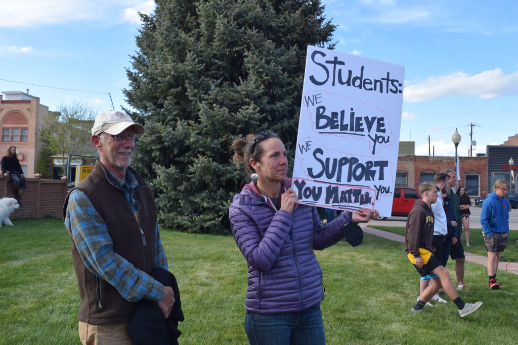 Lander residents Stefani Farris and Tim Hudson attended the protest to show support for students. (Sofia Jeremias/WyoFile)