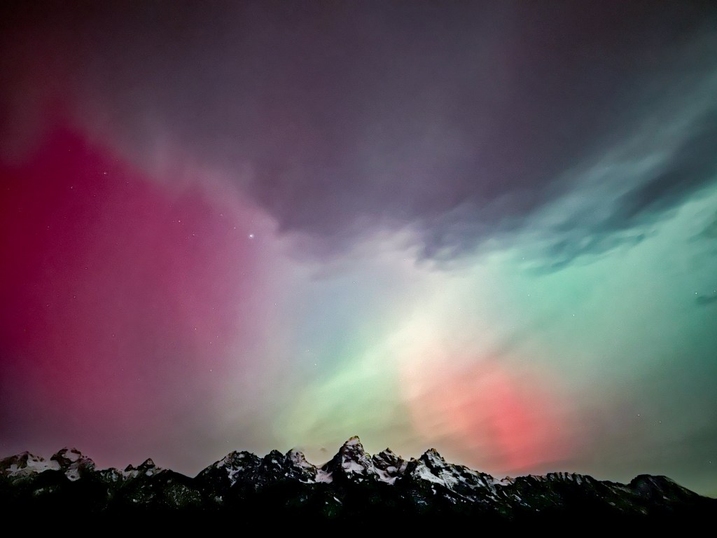 Wilson resident Annabelle Reber headed out to Antelope Flats in Grand Teton National Park to get the ideal shot. She used the slow shutter feature on her cellphone to capture the colorful show over the Tetons. Awestruck aurora watchers crowded the pullouts along the highway, creating roadway conditions similar to bear jams. Reber even had to swerve around a man who suddenly ran across the road in front of her car, she told WyoFile.
