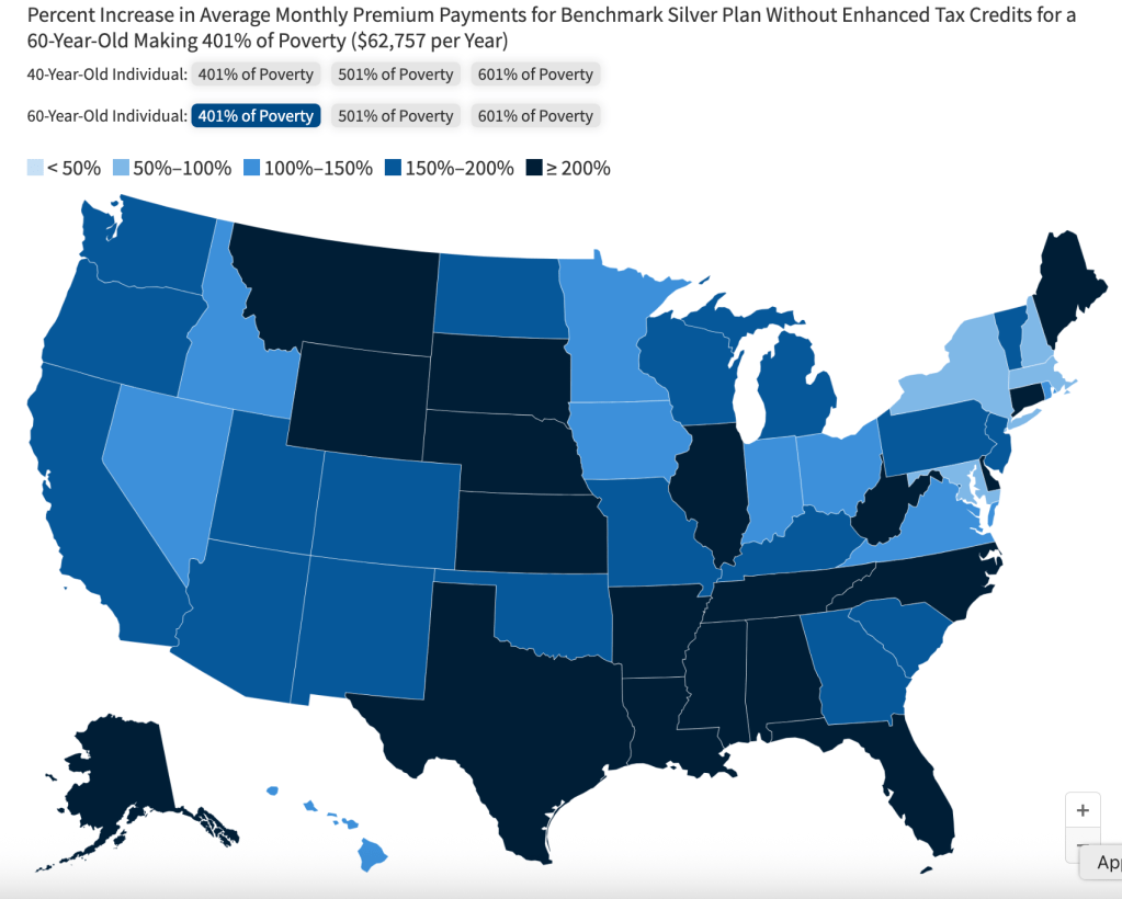 In Wyoming, a 60-year-old person earning roughly $63,000 is facing a 421% increase in average monthly premium costs on the ACA marketplace, according to reporting by KFF, a nonprofit that writes about health care. No other state equals or tops that percentage. The same individual would face increases of 231%, 166%, 192% and 134% if he or she lived in Montana, Colorado, Utah and Idaho, respectively.