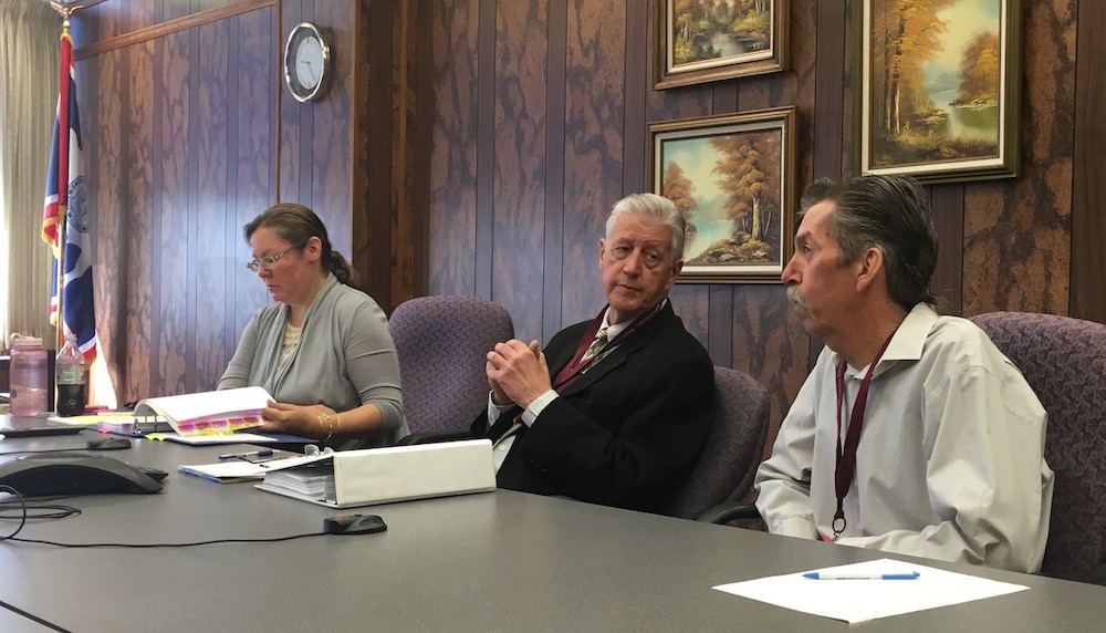 Casper resident Lee Mosser (far right) testifies at a hearing with his attorney Hampton Young (center), while attorney Amy Taheri represents Wyoming Workers’ Compensation in 2016. (Dustin Bleizeffer/WyoFile)