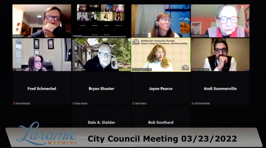 Councilor Pat Gabriel can be seen speaking on the phone during the Laramie City Council’s Zoom meeting on March 23. (Jeff Victor/screenshot)