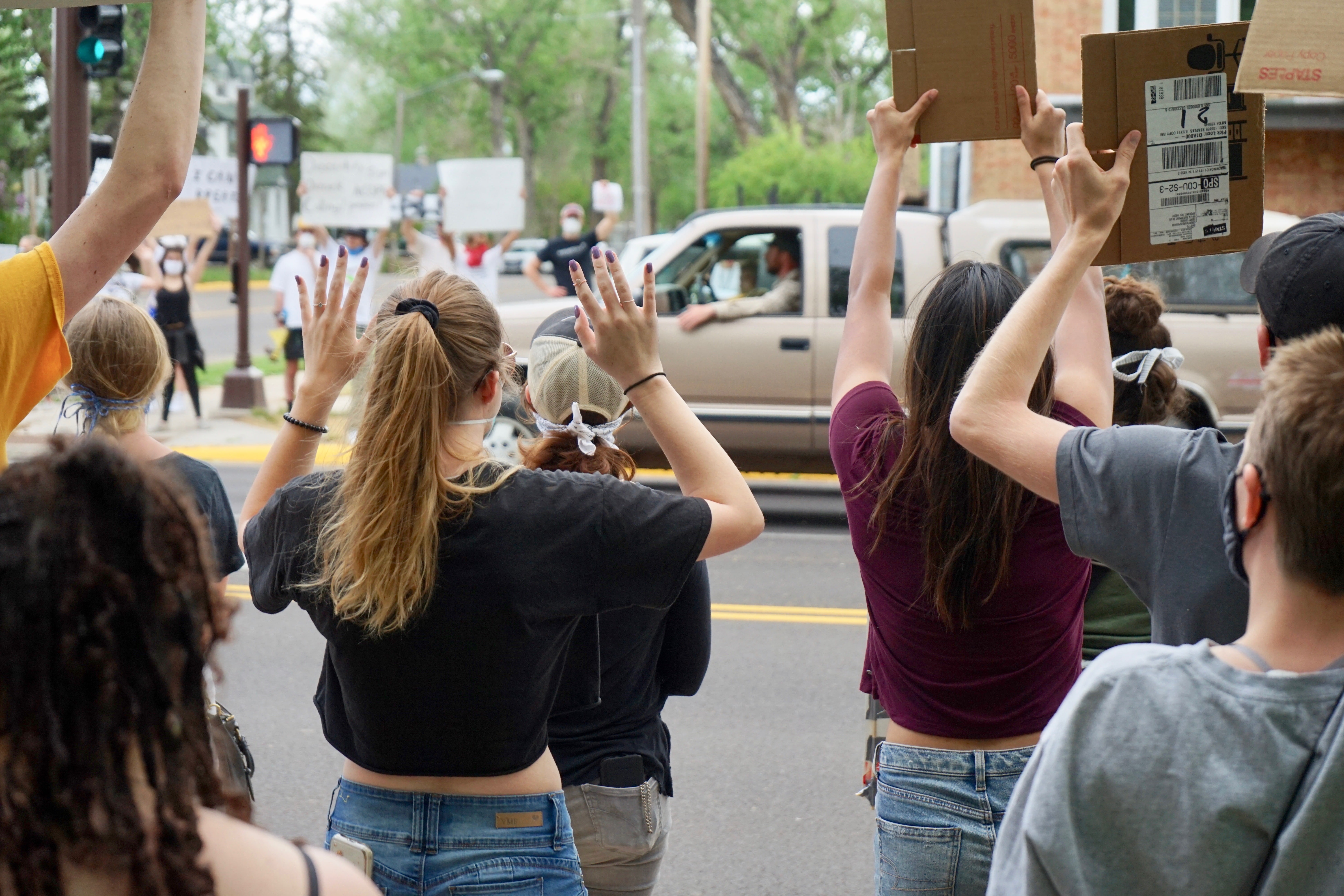 On June 4, a brief confrontation ensued between protesters, the truck drivers and an associated motorcycle driver at an intersection. Protesters chanted at the drivers and the cyclist, who revved their engines over and over before turning off the march route.