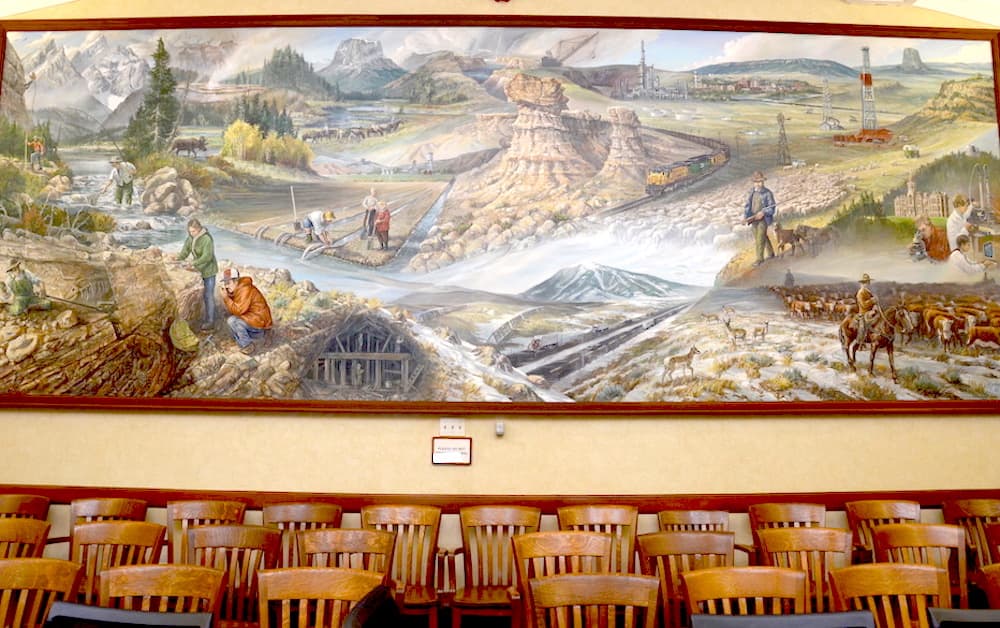 On a wall in the Capitol Building is a mural called “Wyoming, the Land, the People.” Painted in 1980 by Mike Kopriva, it is 8 feet by 22 feet and depicts scenes and residents from around the state. It shows Devil’s Tower and the Tetons, farmers, fishermen, hikers, miners, archaeologists, ranchers, pronghorn, lab technicians, irrigators, the railroad, a sheep wagon, oil derricks, a refinery, a dragline mining coal and a moose, but no Indians.