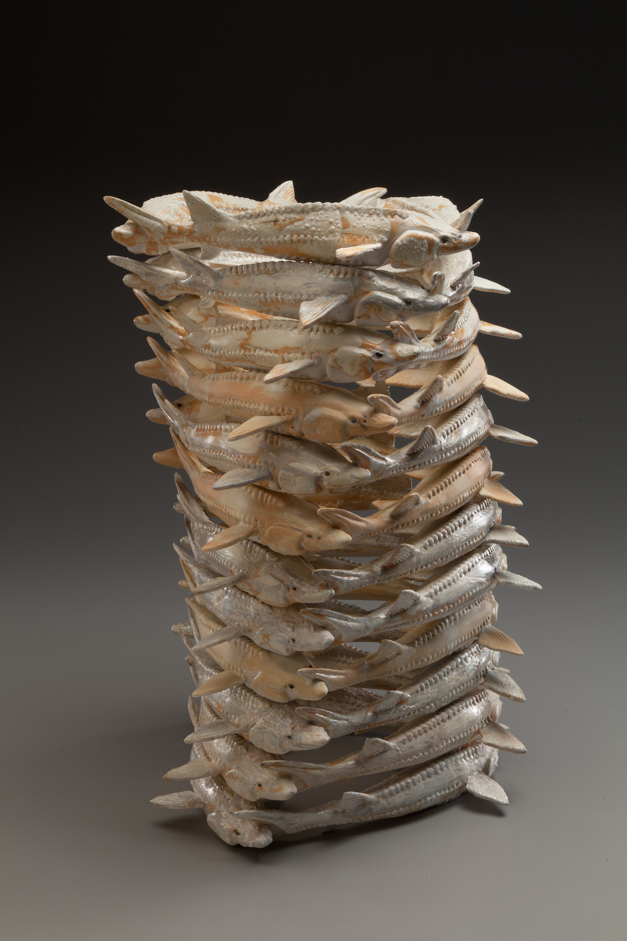 “Circling” is a gravity-defying stacked spiral of sturgeon, the irregular surface a perfect example of the ranges capable of salt-fired porcelain. The fish may be standing still, yet they could just as easily be moving, spiraling through air as if water.