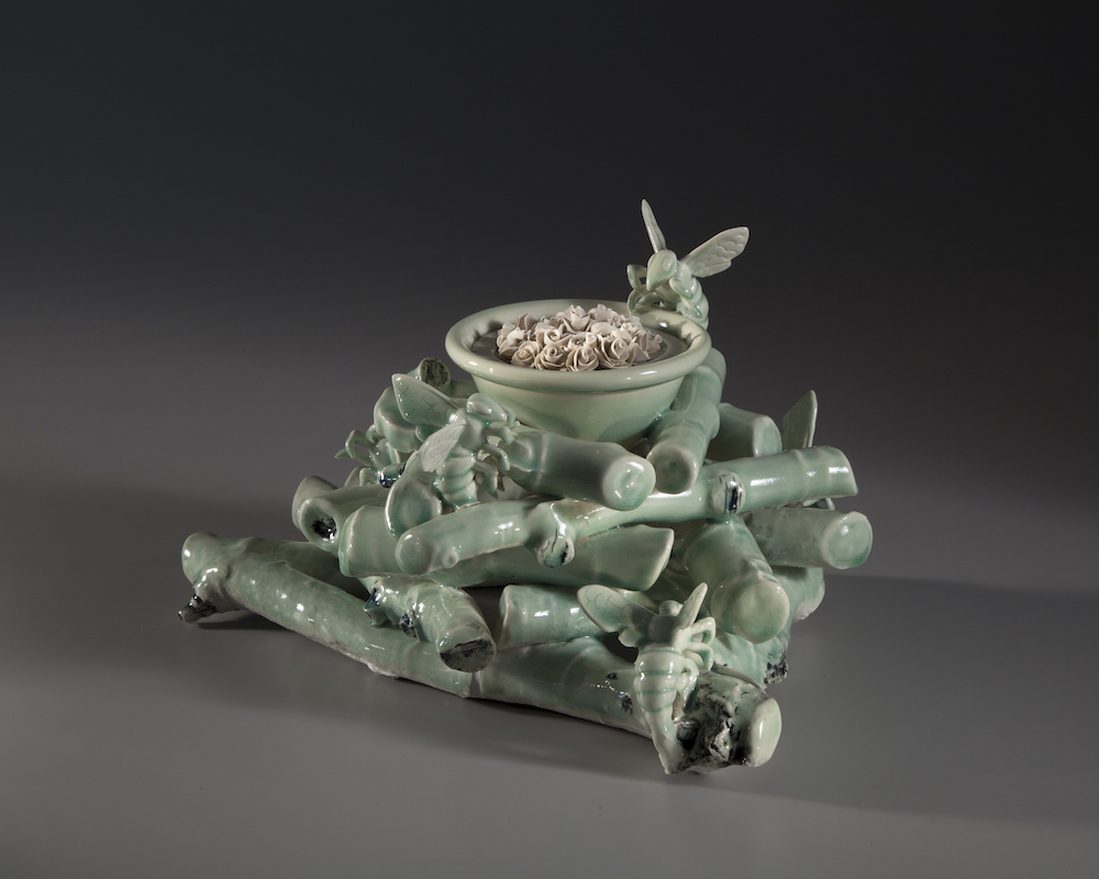These offerings are not the only pieces that feel almost holy. They ask to be seen closer. “Small Bees” and “Still life with bees” showcase detailed sculpted bees hovering near or inside bowls with delicate offerings of porcelain flowers. The bees have been frozen in their busy route, a spotlight on their journey of pollination and production. Cupping a tiny bowl in my hands, I can almost feel the vibration of the bee, wings paused, mid-work at a task that seems thankless but would be incredibly, impossibly missed. The crisp fragility of porcelain drives this home.