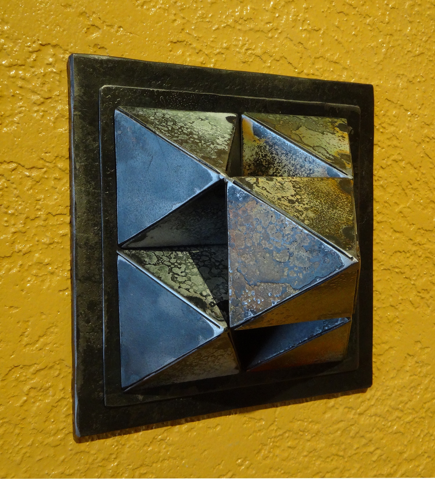 For probably the first time in his art practice, Bond has purchased new sheet metal so he can implement his own choices, unimpeded by the material’s history. He shears from the sheet metal precise triangles, ranging from three to seven and a half inches on a side, then carefully bevels and spot-welds the triangles into different sizes of square pyramids that may stand alone or be combined into more complex structures. Each pyramidal form in the exhibit is either fixed to the wall and aims straight out into the room or is set on a pedestal and points straight up.