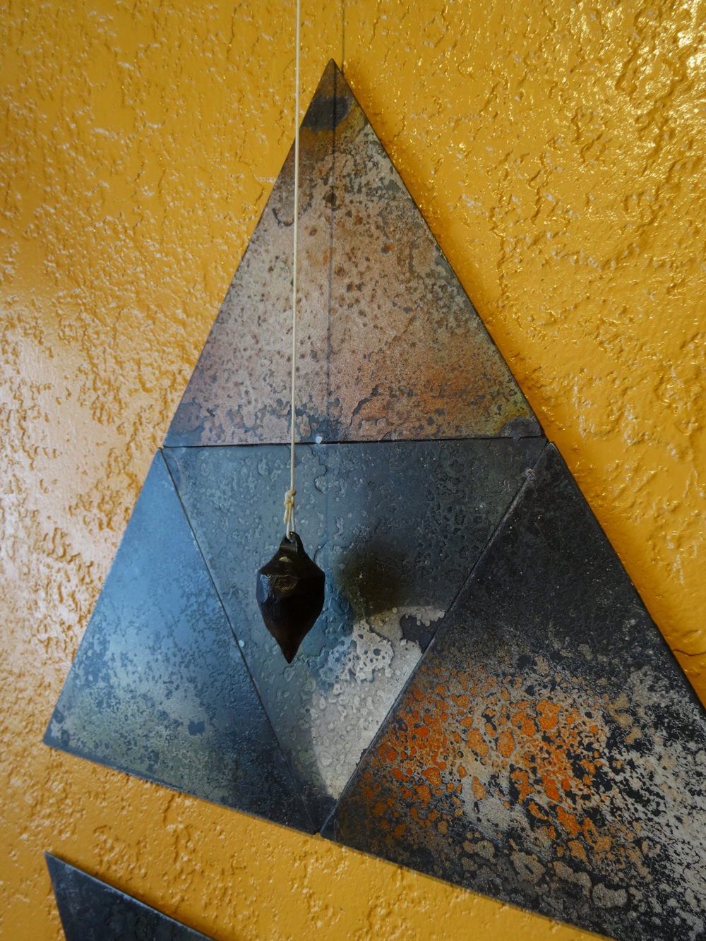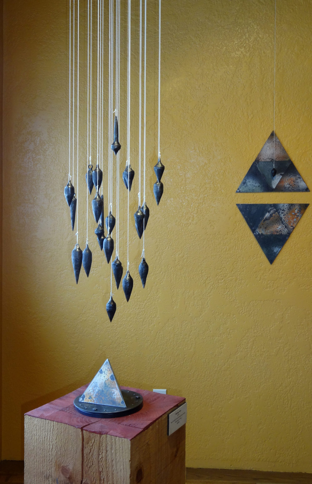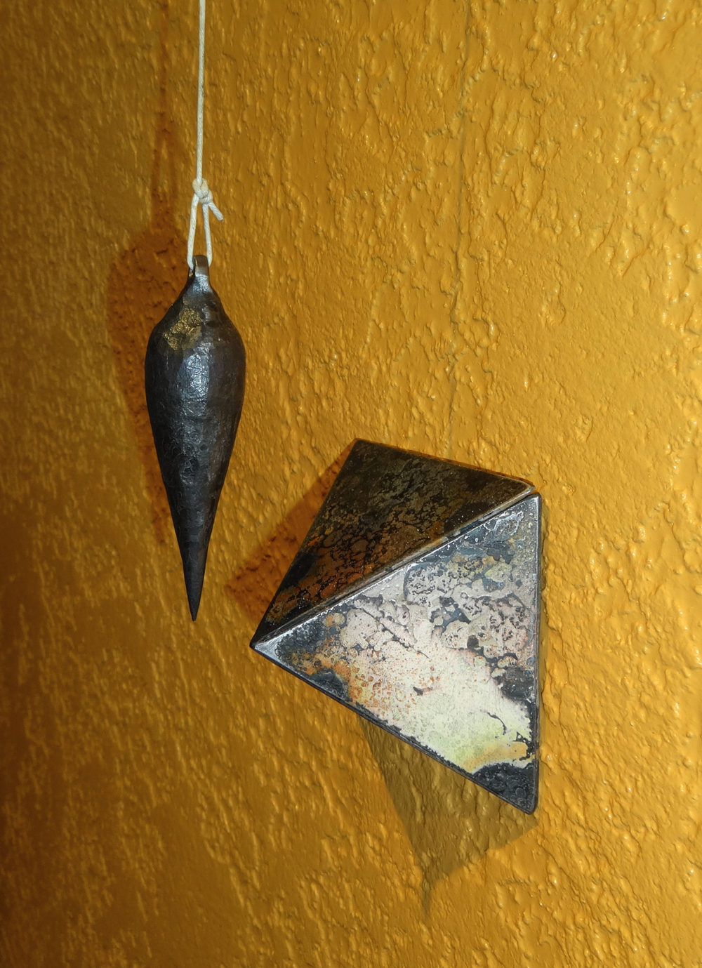 But the pyramids are just half of Bond’s thesis. Most of the sculptures in this exhibit are installations of pyramids from Bond’s newly established process, accompanied by plumb bobs made by traditional forging. Each plumb bob is suspended by a sturdy waxed cord knotted to a custom-forged hanger high on the wall. Each resolutely vertical plumb bob is paired with a pyramid. Their respective tips are close enough to visually connect and build an almost magnetic tension between the two.