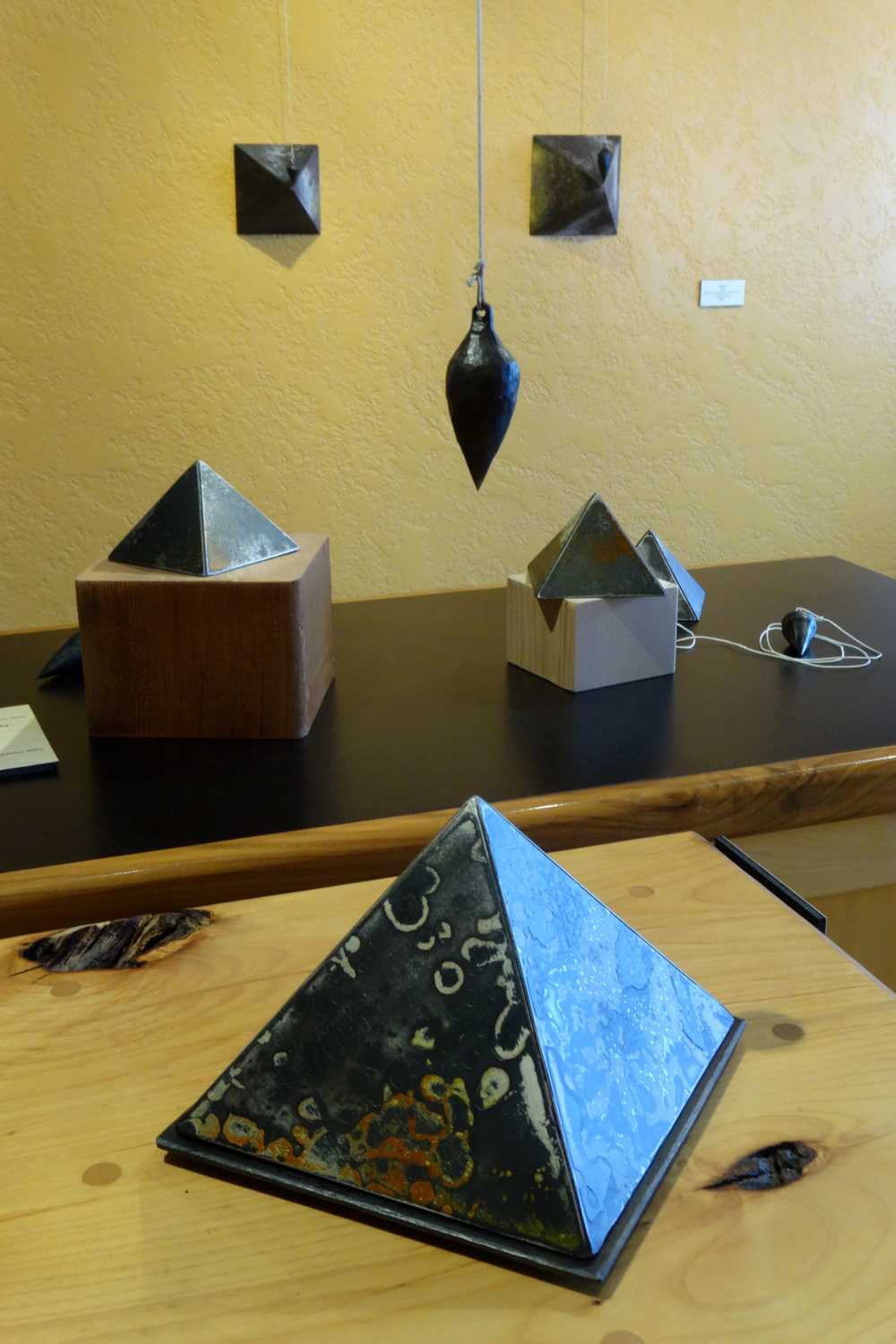Bond’s artist’s statement pays homage to the Egyptian pyramids, and calls attention to the essential role played by the humble plumb bob in those pyramids’ construction. Beyond this general nod toward history, one is free to contemplate the combination for oneself. The gallery offers some of Bond’s small individual pyramids and plumb bobs for sale, allowing one to acquire either or both for a modest price and set up a personal pyramid/plumb bob configuration at home or office.