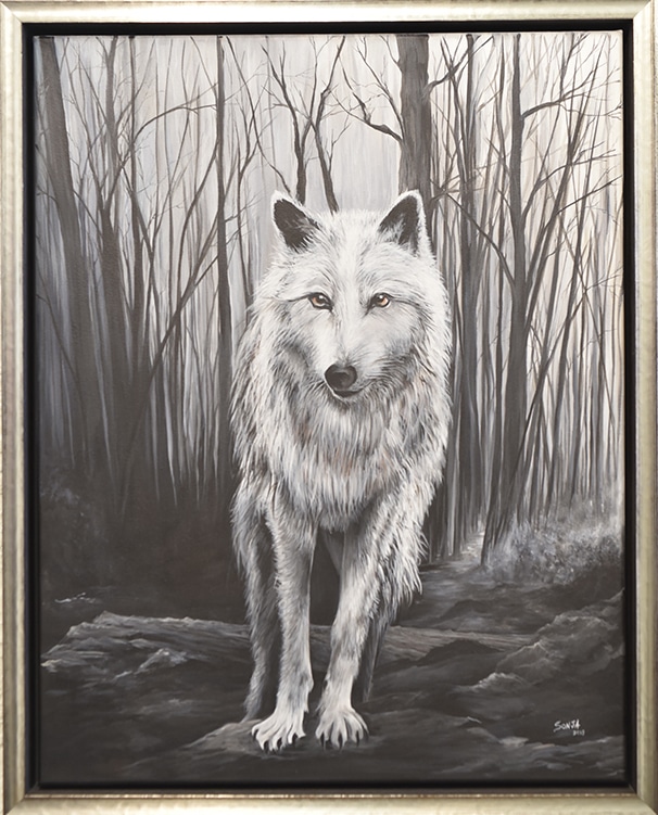 On the other hand, Embers, an acrylic painting by Sonja Jackson, depicts a grey monochrome wolf standing amid burnt trees. Through the artwork, Jackson nods to two controversial local issues of our day: wolves and fires. After reintroduction to Yellowstone in 1995, wolves seem either to be hated, feared, or loved for their hunting habits and ability to thrive. Fires in the West also seem to have a similar effect, being hated and feared and there is debate about prescribed burning to avoid community destruction. We are not sure what message the artist intends simply upon viewing, but the piece creates questions and raises awareness of these issues.
