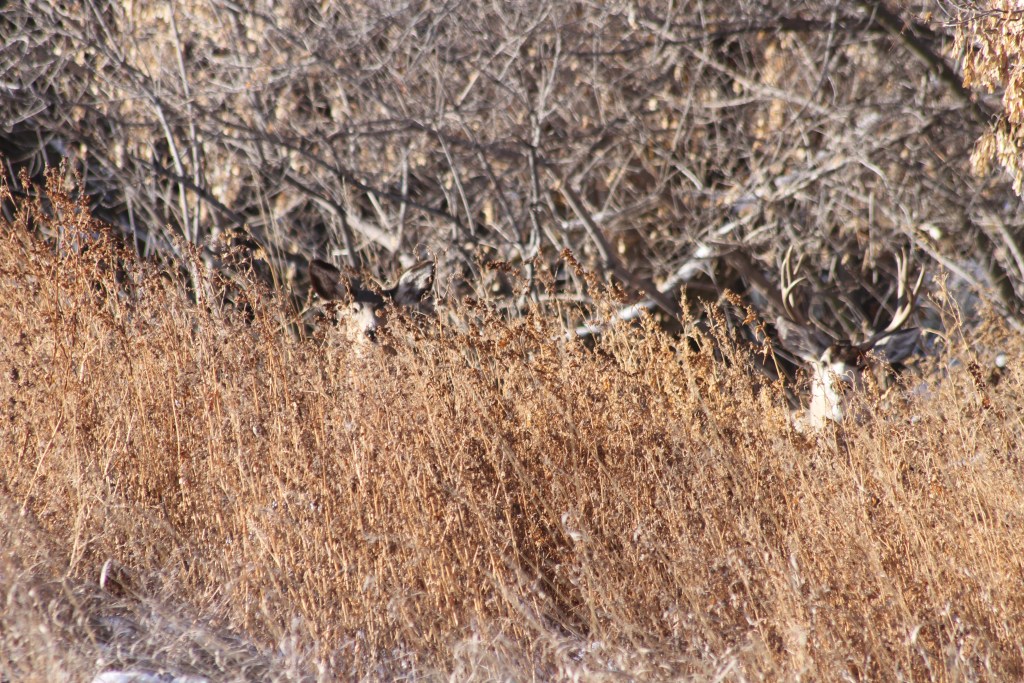 Look again at the antlers (forked), tail (smaller and black tipped), stature (big, muscular) and finally the ears (like a mule’s, almost) — and that would be a rare sight to see white tail in a dry barren patch of cheat.