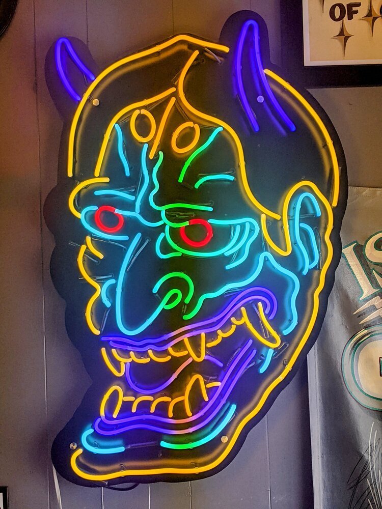 One of her favorite, and most difficult, pieces she created was a 4-foot-tall hannya mask for a tattoo shop in Fort Collins, Colorado. Working with the tattoo artist’s design, she had to determine the lines to highlight with neon. She consulted artist friends about color balance and had to figure out how to combine different colored tubes.