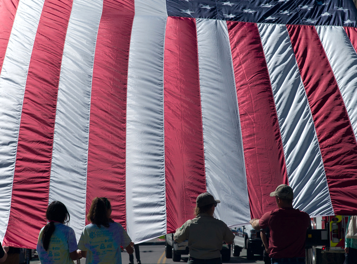 Jackson Hole Fire/EMS owns the flag that hung across North Willow Street and brings it out for Old Bill’s and other special events. Firefighters use ladder trucks to raise the Stars and Stripes over the road.