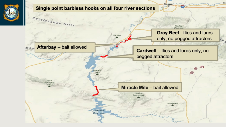 Only single barbless hooks will be allowed in the future along all four North Platte River sections downstream from Seminoe Reservoir. Additionally, fixing egg patterns and other attractants to lines above hooks — a setup known as “pegged attractors” — will no longer be permitted on the river’s Cardwell and Gray Reef sections. (They’ll still be allowed on the Miracle Mile and Afterbay stretches, where bait will also remain legal.)