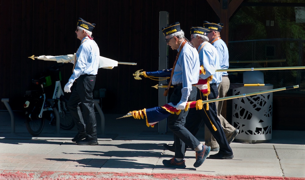 American Legion Post 43 color guard led the Fourth of July column with nine standards representing the U.S., POWs, Wyoming, Army, Navy, Marines, Coast Guard, Air Force and the legion post.