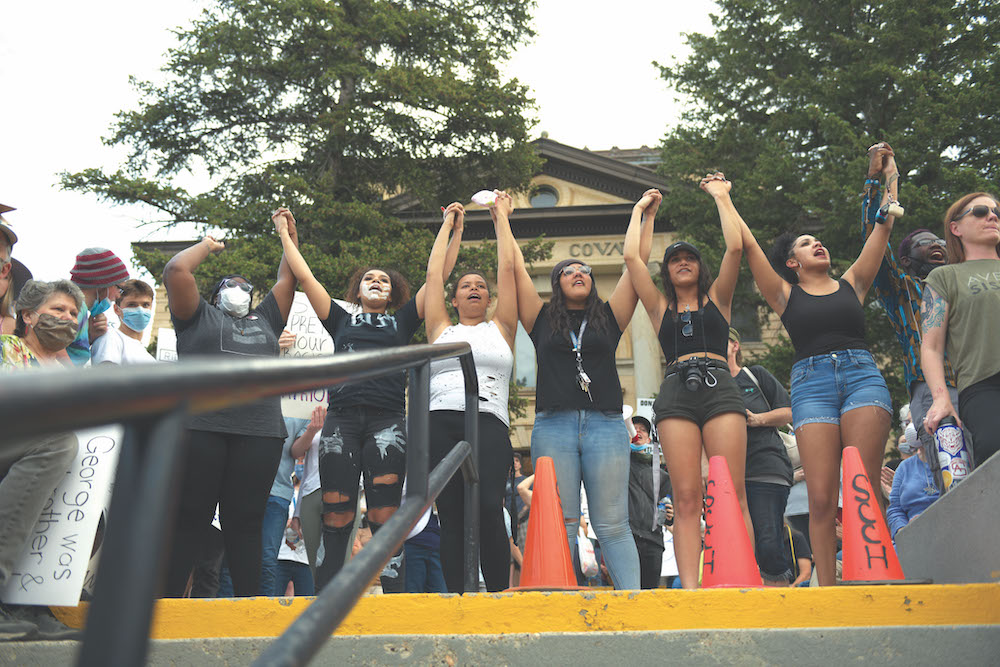 Ellen Weddington, Ella Volynets, Cassidy Creel and Stephanie Marks of Jackson join more than 100 other people in Pinedale on June 4, 2020, to protest the killing of George Floyd. (Ryan Dorgan/Jackson Hole News&Guide)Protesters gather on the steps of the Sheridan County Courthouse as part of a June 5, 2020, demonstration against police violence and racism. (Allayana Darrow /The Sheridan Press/Wyoming News Exchange)