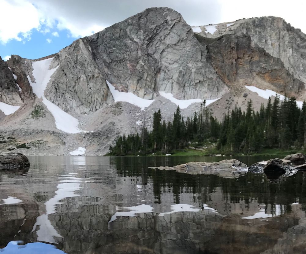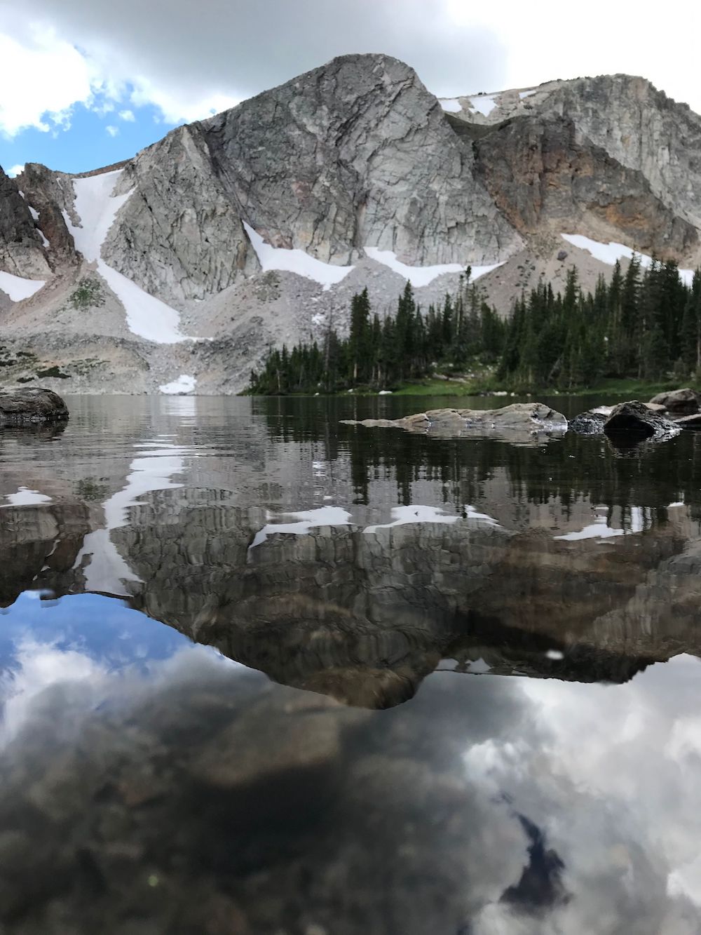 When they got to Lake Marie at the foot of Medicine Bow Peak, the water was glassy and still, showcasing a stunning reflection of mountain and sky.