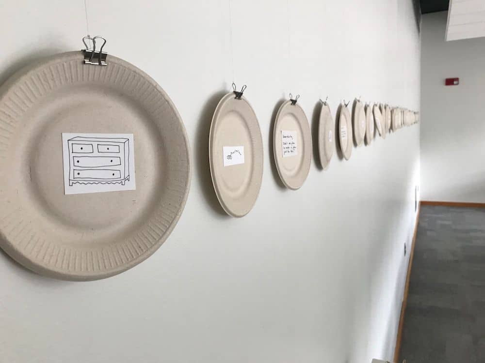 The second part of the virtual exhibit is in the center’s conference room and is called “Sticky Situations.” Jenny Dowd’s simple pen and ink drawings are set into recyclable paper plates and mounted in a long row. In the video, the camera pans to each one while Daly recites one of his short poems from the rear of each piece. Should you visit in person and be curious about reading the poems yourself, disposable bamboo sticks are located on the table for a whimsical exercise in pandemic-era plate flipping.