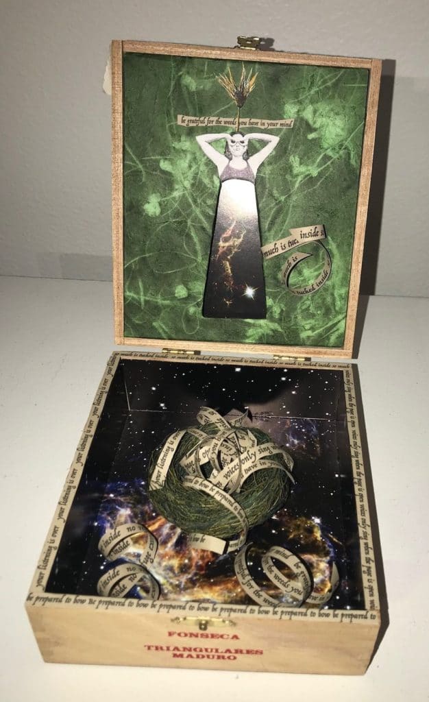 The 3-D artwork by Chris Wimberg that contains the poem is a bit of a patchwork itself. A flip-top wooden cigar box opens to show a woman in the foreground against green velvet fabric. She wears a formal dress and feather headdress. She peers at us through those comical spyglasses kids make with their hands. The words are typed on strips of paper resembling old-fashioned ticker tape and spooled around the woman’s image, through the box, even written on its side. A ball of twine rests beneath the spooled words. Weineke reads the cento in a soothing voice that reels out the magic in words removed from their context and rearranged.