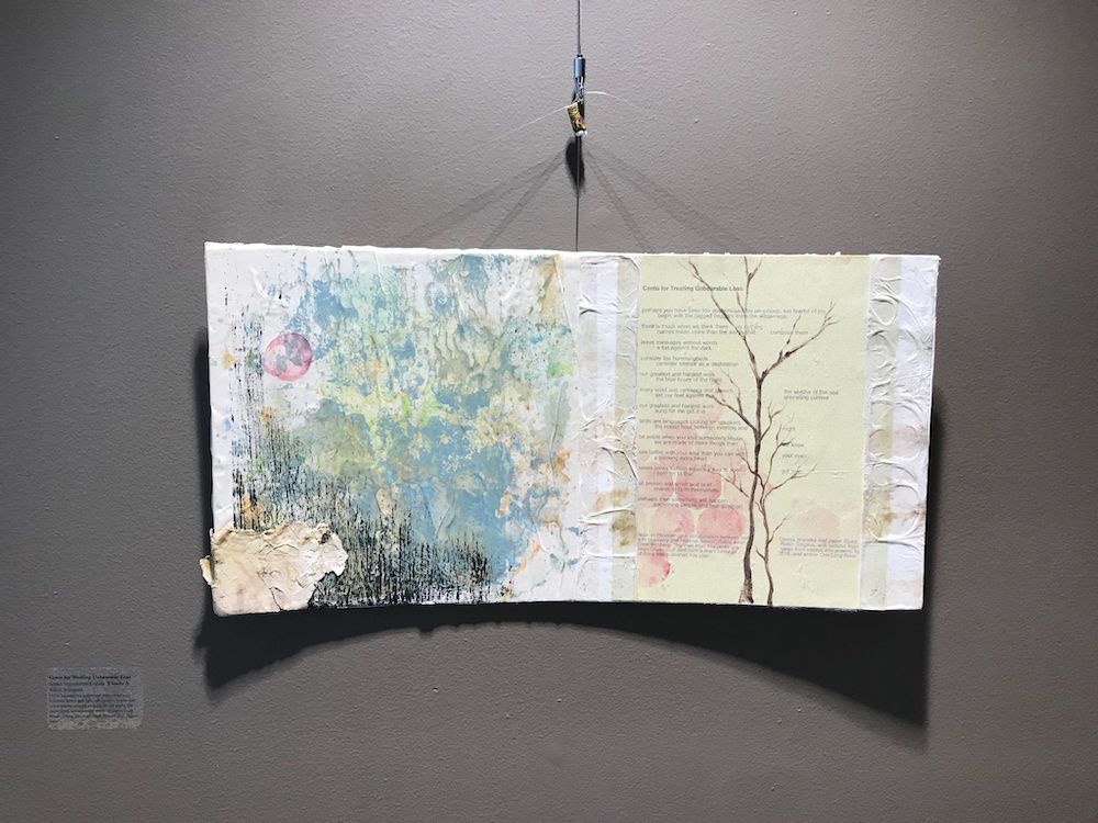 Kutchins’ couplets have been broken apart, printed in different fonts, and inserted into Ava Reynolds mixed-media artwork of two panels. From a distance, the earth-colored rounded forms look rock-like and are surrounded by wavy circles. Click on “full screen” to enlarge the work and you can imagine the rock shapes as the summits of mountains, the wavy circles the lines on a topo map. More recognizable rocks rest at the bottom of the plain wooden frames. The five shers feature mentions of rocks and landmarks of the Rocky Mountains: Teewinot, Muddy Mountain, Elk Mountain. The rocks are welcoming and terrifying at the same time.
