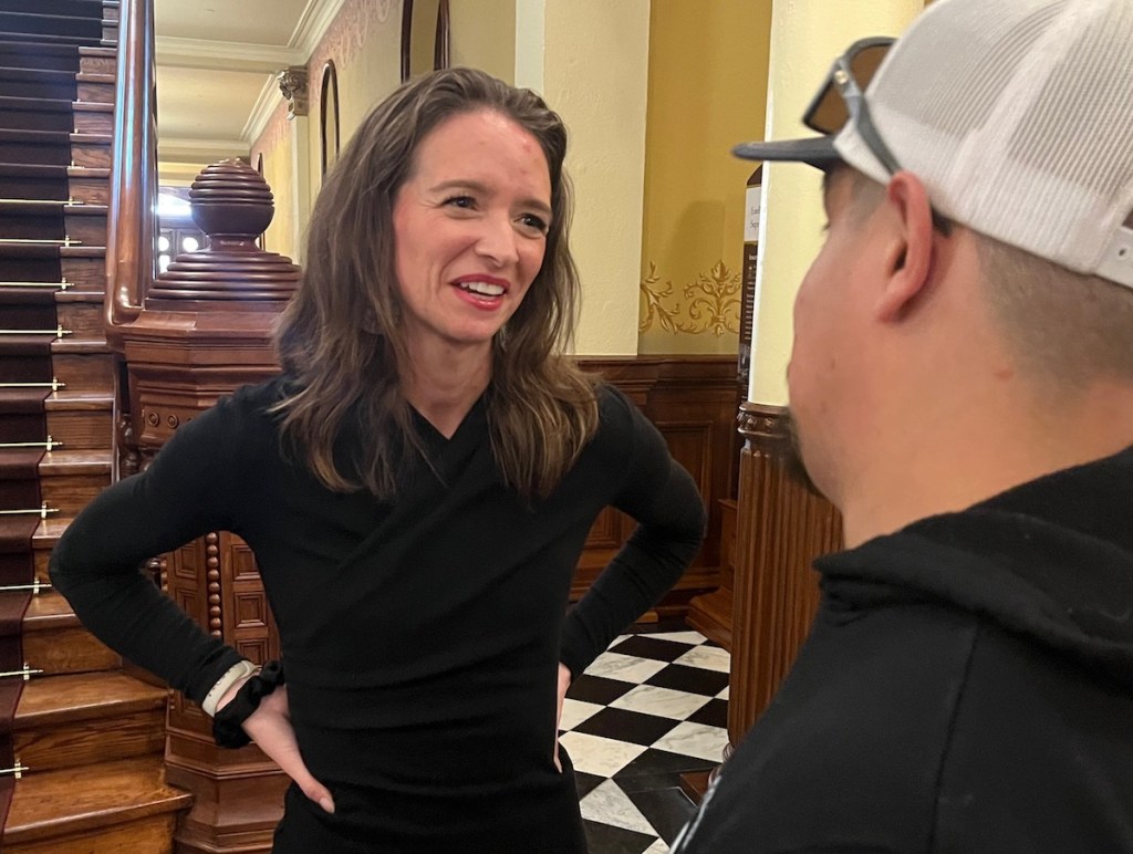 Wyoming State AFL-CIO Executive Director Marcie Kindred speaks with a worker during an event at the Capitol in April 2025. (Dustin Bleizeffer/WyoFile)