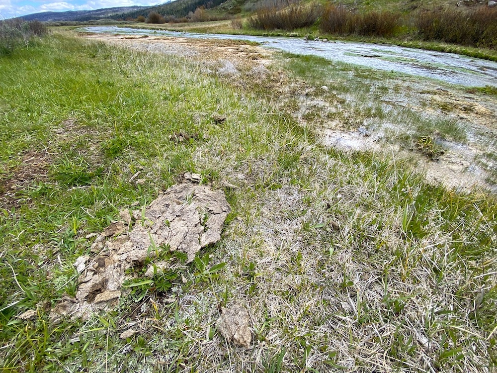 Kendall Warm Springs burbles to the surface along a series of small bluffs above the Green River. It flows no deeper than a foot and as narrow as about 15 feet around mossy matts of vegetation to the bank of the Green River.