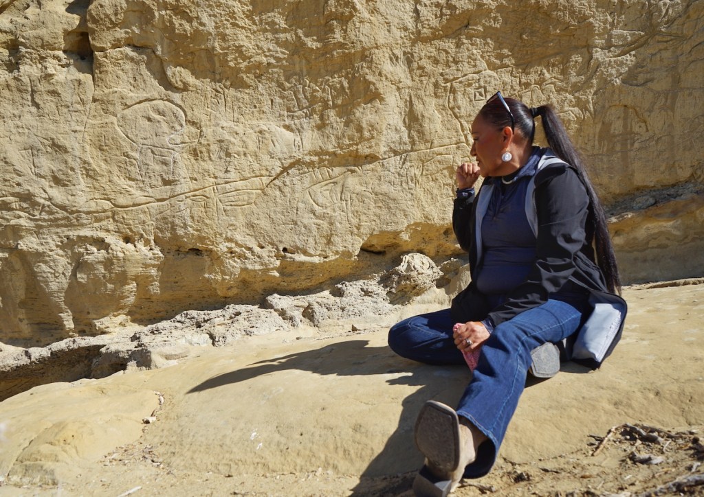 At the White Mountain petroglyphs, a lonely sandstone monolith etched around the base with pregnant creatures, animal tracks and the squiggles of landforms, Soldier Wolf pointed out where modern chalk or carving has damaged the panels. The public can walk right up to the rock wall, she said; “There’s nothing mitigating any of this.”