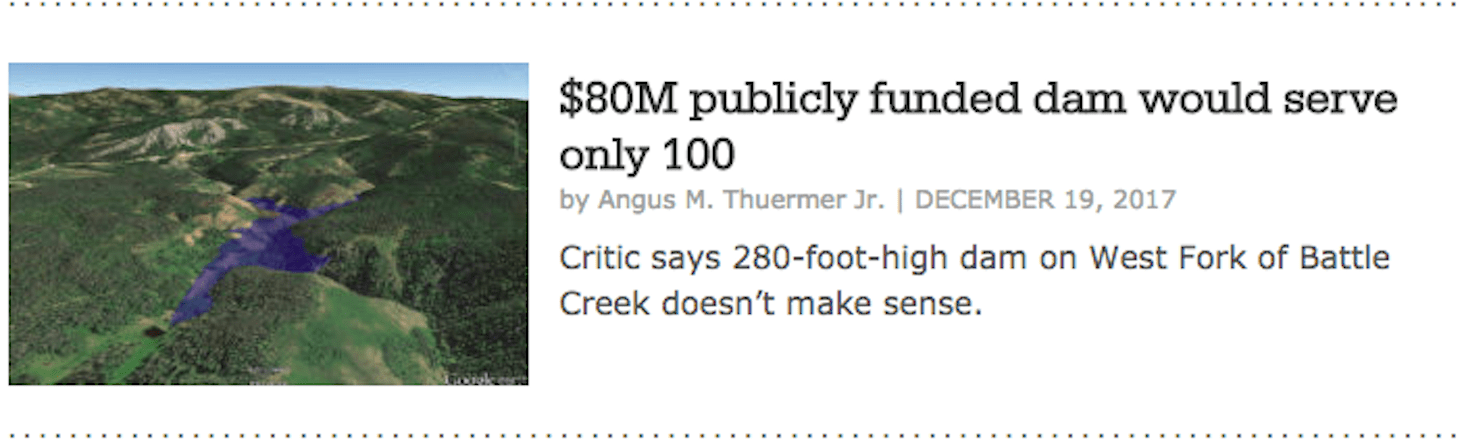 Soon after the Wyoming Water Development office released its final report in the fall of 2017 supporting a proposed $80 million dam on the West Fork of Battle Creek critics began to question the project. It would supply supplemental irrigation for 67 to 100 ranchers, fueling skepticism that spread to include a majority of the state House of Representatives. Representatives stripped funding from the project, but reached a compromise with the Senate that kept the project alive. Now water developers seek to secure pro-rata funding from Colorado, which would benefit from the dam, and 100 acres of U.S. Forest Service property for the proposed 10,000-acre reservoir.