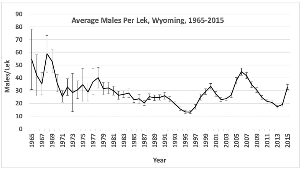 In 1996, a low point, the average lek in Wyoming held 13.1 males, according to a compilation through 2015 by the Western Association of Fish and Wildlife Agencies. Christiansen said 1995 was the nadir.