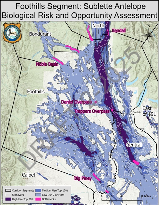 The “Foothills segment” of the Sublette Pronghorn Herd’s potential migration corridor is detailed in this map. (Wyoming Game and Fish Department)